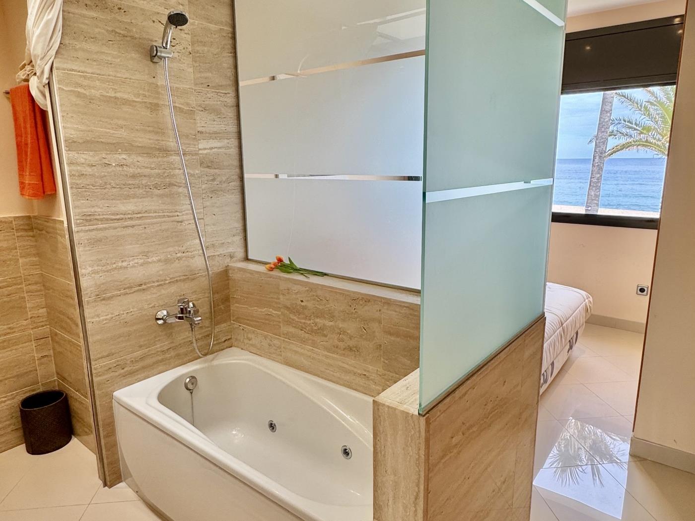 1 bedroom suite with 1 double bed and built-in wardrobes, exterior windows with wonderful views of PLAYA CRISTAL, a television, and a full bathroom with a whirlpool tub.